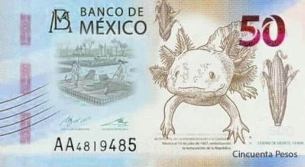 Meaning “water monster” in Nahuatl, the axolotl was symbolically important to the Aztecs. They considered it a wee living embodiment of Xólotl, the god of death and lightning. Still today, it’s an important part of Mexico’s fauna and culture: Diego “Mr. Frida” Rivera featured axolotls in his paintings, and in his tiled Mexico City fountain, the Fuente de Tláloc. Since 2022, the endemic amphibian also features on a 50-peso note.