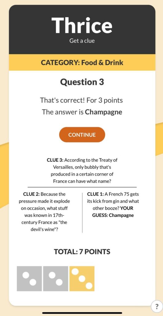 Welcome to Thrice, where it’s trivia night every day. Each game includes a set of 5 questions with 3 clues per question, closing stats with sharing capabilities for socials.