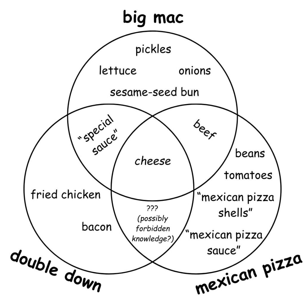 I have made an extremely helpful Venn diagram in case you ever find yourself in a fast food emergency wherein you must distinguish between these three items because the Hamburglar has taken hostages at the combination KFC/Taco Bell. Always be prepared!