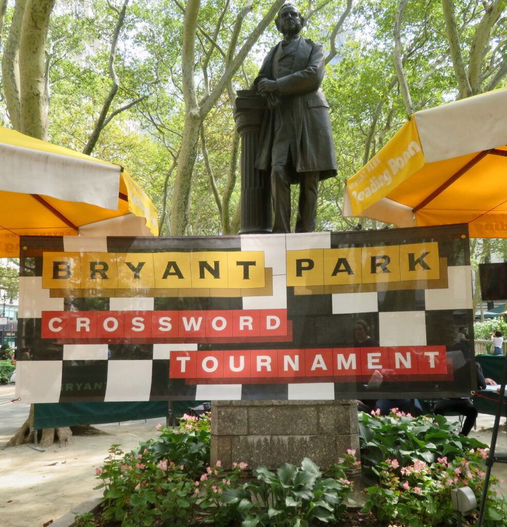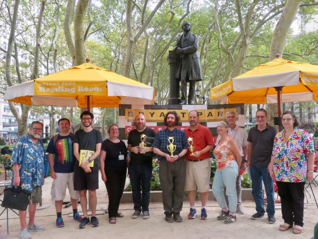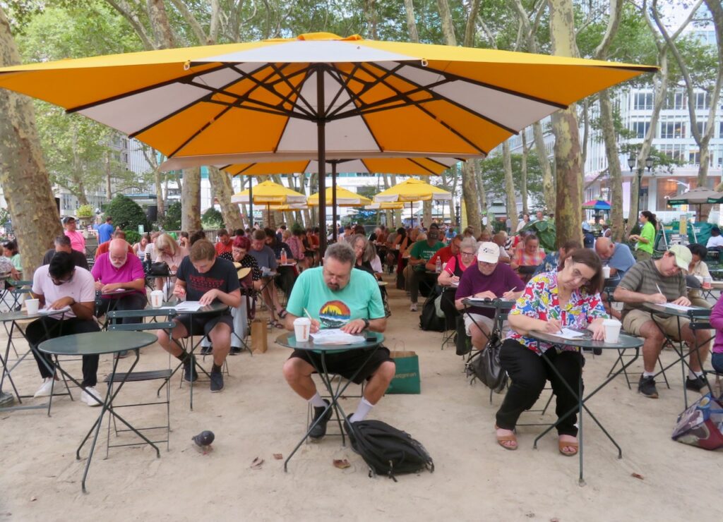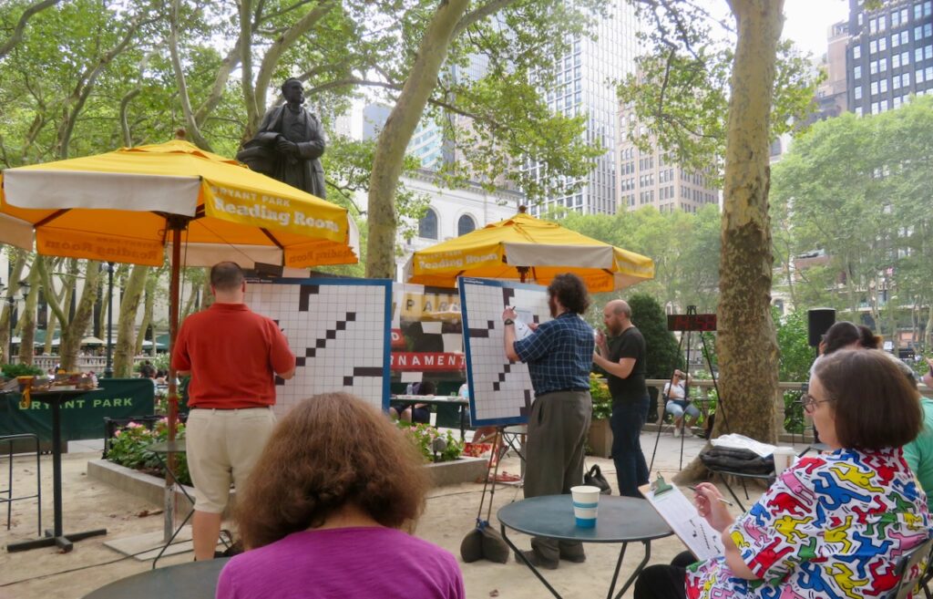 If indoor crossword tournaments are your jam, you likely know about Lollapuzzoola in Manhattan’s West Side each August. But if you like solving your puzzles al fresco, perhaps you were among the dozens of folks who enjoyed an afternoon in Midtown on Sept. 9, when Amy Goldstein and Mike Shenk hosted the fifth annual Bryant Park Crossword Tournament. Congrats to Glen Ryan, Dan Schwartz, and Ken Stern on their podium finishes – and look out for Tournament #6 in September 2024!