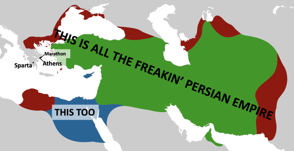 That map shows part of why Persia thought it would be pretty easy to gobble up Greece. Another reason? “Greece” wasn’t really Greece, but just a mishmash of city-states that had been squabbling over internal borders for centuries. As for the dueling titans of Athens and Sparta, though they’d both been keeping a wary eye on Emperor Darius’s designs, hadn’t really firmed up plans to join forces if push came to shove.