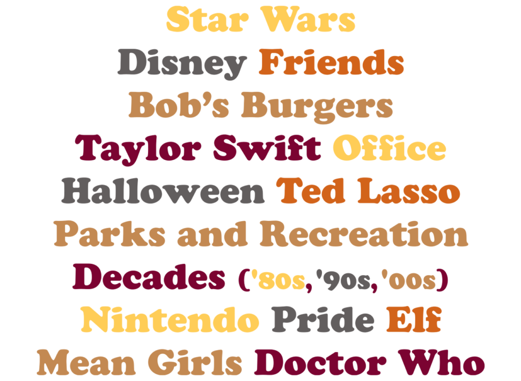 And more: A Christmas Story • Breaking Bad/Better Call Saul • Broadway • Christmas Vacation • Denver Sports • Disney Princesses • Friendsgiving • Galentine’s Day • Gilmore Girls • Hocus Pocus • Home Alone • Marvel Cinematic Universe • National Lampoon’s Christmas Vacation • Pixar • RuPaul’s Drag Race • Schitt’s Creek • Seasons Geekings (a holiday quiz) • The Office