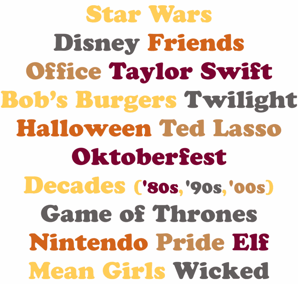 And more: A Christmas Story • Breaking Bad-iverse • Broadway • Disney Princesses • Doctor Who • Friendsgiving • Galentine’s Day • Gilmore Girls • Hocus Pocus • Home Alone • Marvel Cinematic Universe • National Lampoon’s Christmas Vacation • Parks & Recreation • Pixar • RuPaul’s Drag Race • Schitt’s Creek • Seasons Geekings (A Holiday Quiz) • Stranger Things • Wednesday
