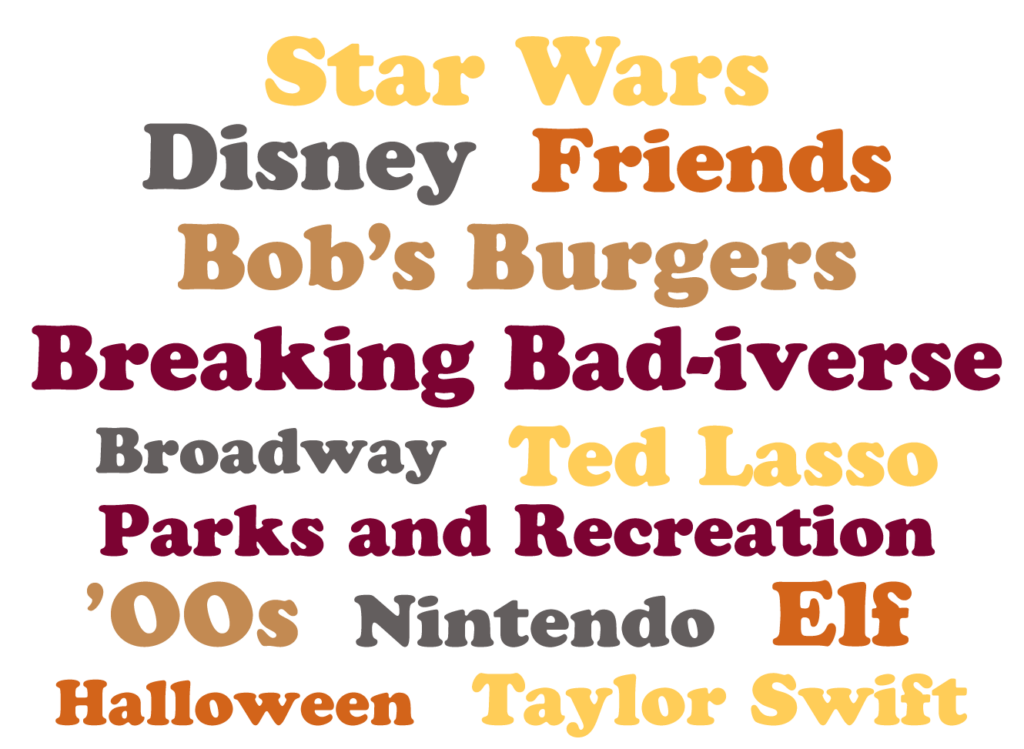 And more: ’80s • ’90s • A Christmas Story • Bootlegged Child Wizard • Christmas Vacation • Denver Sports • Disney Princesses • Elf • Friendsgiving • Gilmore Girls • Hocus Pocus • Home Alone • Marvel Cinematic Universe • National Lampoon’s Christmas Vacation • Pixar • Pride • RuPaul’s Drag Race • Schitt’s Creek • Seasons Geekings (a holiday quiz) • The Office
